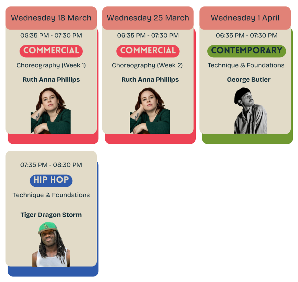 George Butler is a professional dancer, choreographer, and teacher known for his high-energy style, musicality, and engaging teaching approach. With experience performing, judging, and teaching across the UK and Europe, George specialises in helping dancers build confidence, technique, and performance quality. His classes are welcoming, challenging, and designed to push dancers of all levels while keeping the joy of movement at the heart of the room.